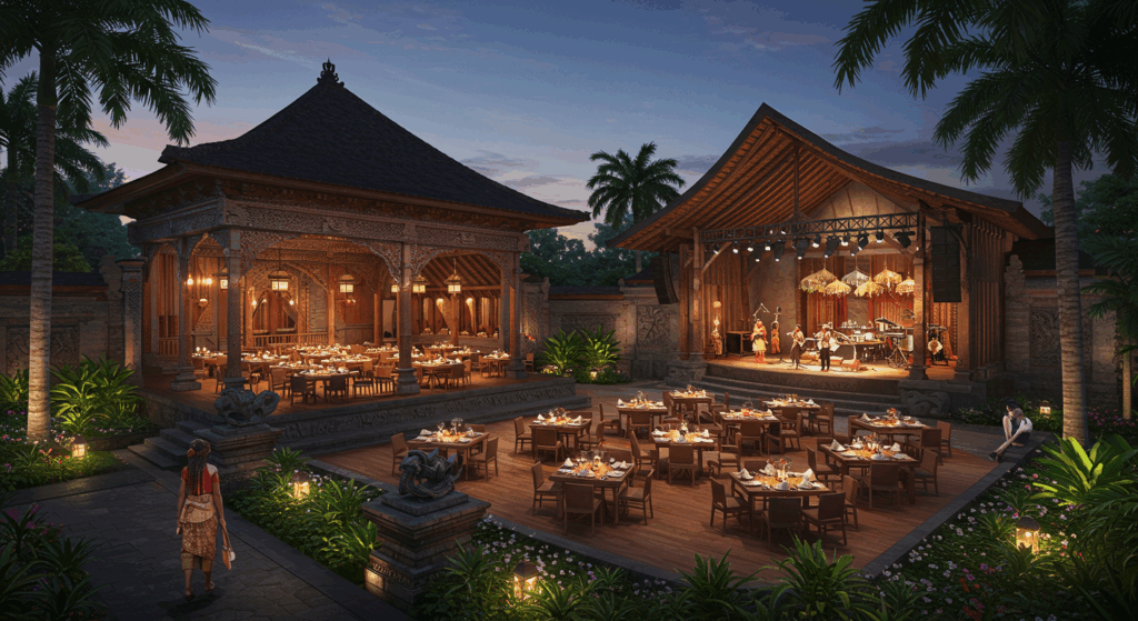 Our Architect and Architectural Services for Dinner Theaters in Bali design stylish, comfortable, and atmosphere-rich venues that seamlessly combine fine dining with captivating live performances, enhancing Bali’s entertainment and culinary scene.