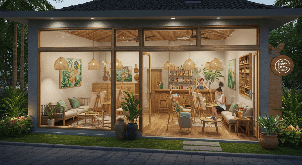 Our Architect and Architectural Services for Paint-and-Sip Studios in Bali create charming, creative, and inviting spaces with ample lighting and comfortable seating, offering a fun and inspiring environment for art and socializing.
