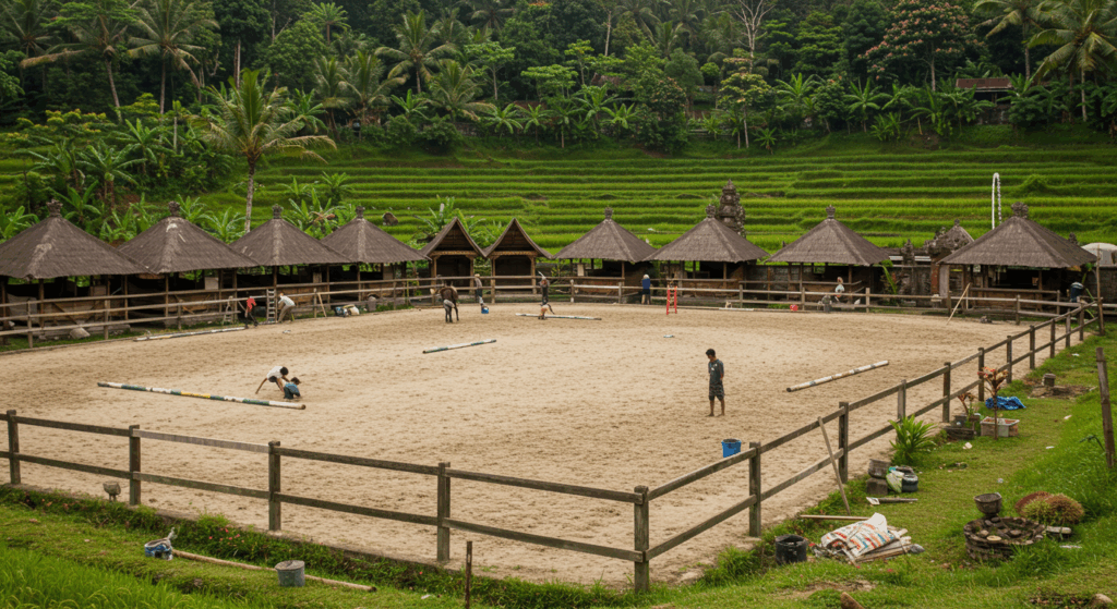 Our Exterior Services for Horse Arenas and Stables in Bali create durable, well-ventilated spaces that offer comfort, safety, and functionality for equestrian activities and horse care.