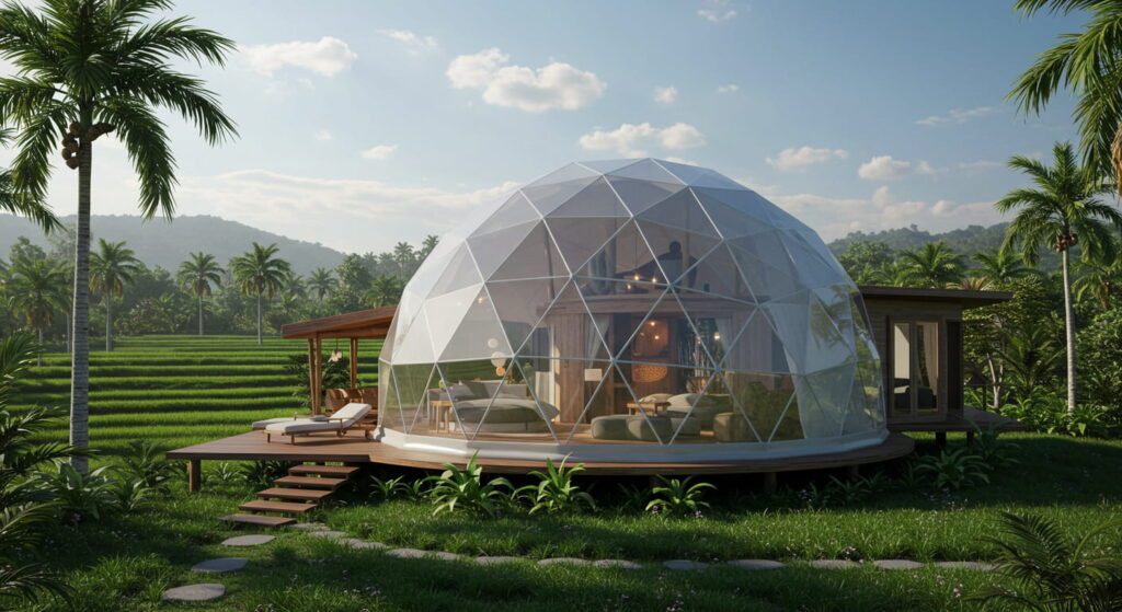 Our exterior design services for geodesic domes in Bali combine innovative architecture with sustainability, creating unique, energy-efficient structures that blend with the island’s natural beauty. Using eco-friendly materials and advanced design techniques, we ensure these domes offer both comfort and harmony with Bali’s environment.