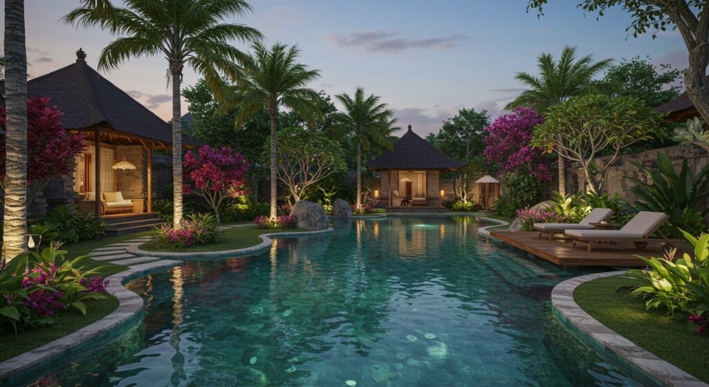 Our exterior design services for natural swimming pools in Bali create beautiful, eco-friendly swimming environments that blend seamlessly with the island’s natural landscape. Using sustainable materials and natural filtration systems, we design pools that offer a chemical-free swimming experience while enhancing the beauty of your surroundings.