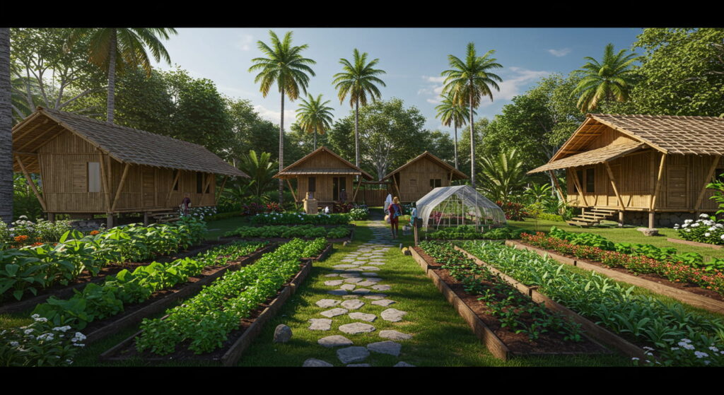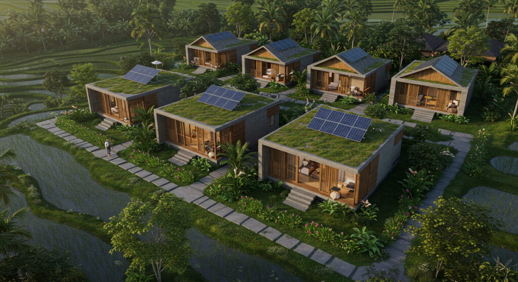 Our exterior design services for eco-villages in Bali focus on creating sustainable, community-oriented spaces that integrate eco-friendly buildings with nature. Using renewable materials and green technologies, we design exteriors that foster environmental harmony, resource efficiency, and a sense of community in Bali’s breathtaking landscapes.