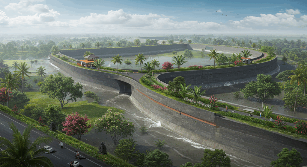 Our exterior design services for flood control systems in Bali, such as levees and floodwalls, focus on creating effective, durable, and visually harmonious solutions that blend with the island’s natural landscape. We prioritize sustainable materials and eco-friendly design practices to minimize environmental impact while ensuring the systems provide essential protection against flooding. Our designs aim to seamlessly integrate these critical infrastructures into Bali’s coastal and riverine environments, preserving the island’s natural beauty while safeguarding its communities and ecosystems from flooding.