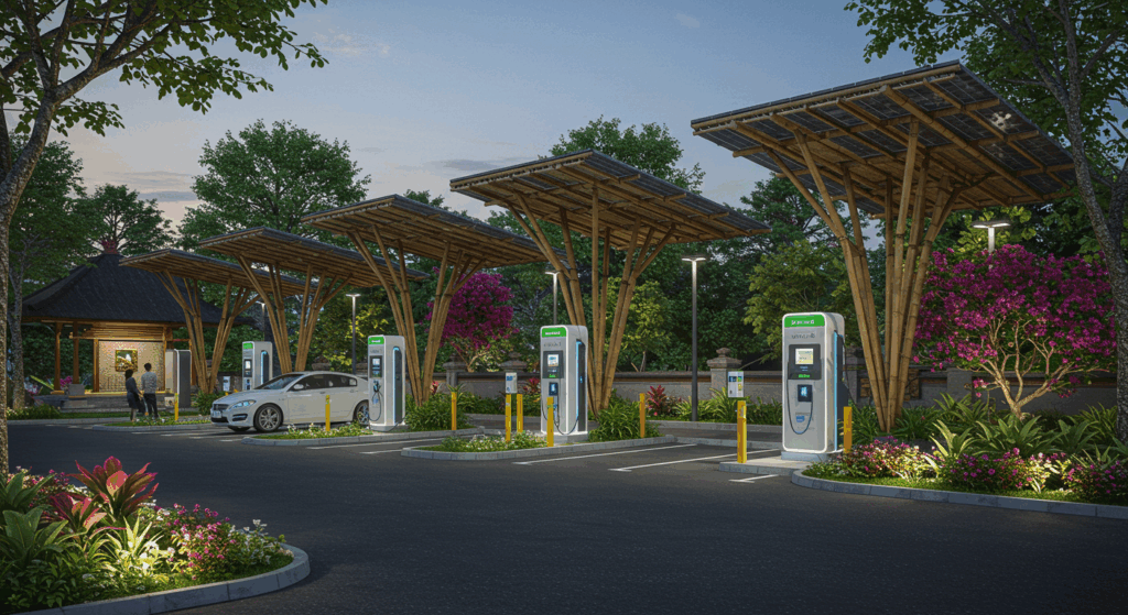 Our exterior design services for green energy infrastructure in Bali, such as electric vehicle (EV) charging stations, focus on creating sustainable, functional, and aesthetically harmonious spaces that support the island’s transition to clean energy. We use eco-friendly materials and innovative design principles to ensure that each facility is efficient, easy to use, and visually integrated into Bali’s unique environment. Our designs prioritize user convenience, accessibility, and minimal visual impact, while reflecting the island’s commitment to sustainability. By blending cutting-edge green technologies with Bali’s natural beauty and cultural heritage, we aim to create infrastructure that enhances both the environment and the local community’s experience.
