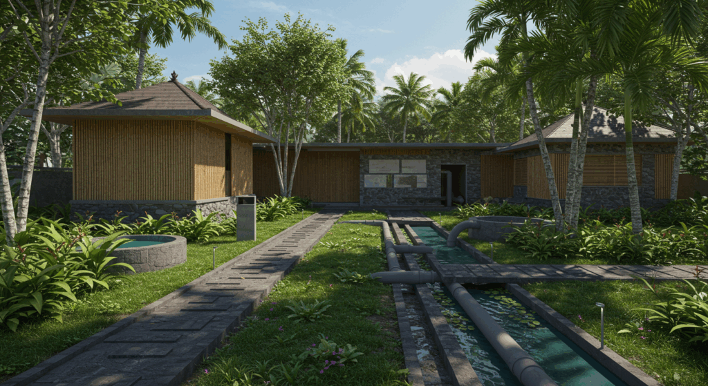Our exterior design services for water treatment plants in Bali focus on creating functional, sustainable, and visually unobtrusive facilities that blend seamlessly with the island’s natural environment. We use high-quality materials and eco-friendly design principles to ensure the durability and efficiency of these essential infrastructures. Our designs prioritize both operational needs and aesthetic harmony, ensuring that the plant integrates smoothly into its surroundings while maintaining a commitment to sustainability. We aim to create water treatment plants that not only serve the community but also respect and complement Bali’s stunning landscapes.