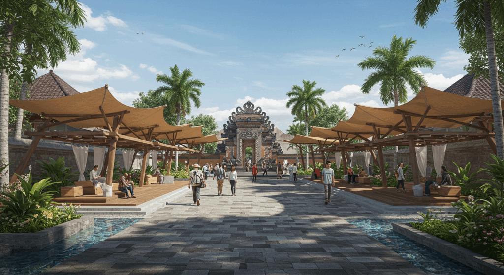 Bali is a place where outdoor spaces are as much a part of its cultural and natural beauty as its exterior landscapes. Public spaces, from bustling marketplaces to serene parks, serve as vital hubs that blend the island’s rich traditions with modern design principles. The architecture and layout of these spaces not only reflect the vibrant Balinese spirit but also enhance the social and environmental experience. Whether it’s creating walkable plazas that invite both locals and visitors or designing green spaces that provide respite amidst the urban landscape, exterior design for public spaces in Bali aims to foster community, culture, and harmony with nature.