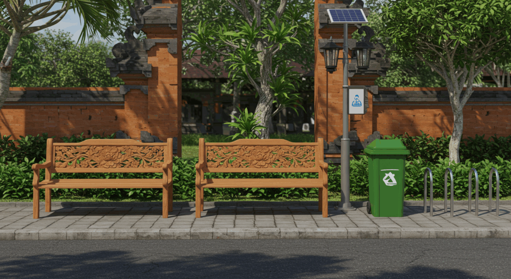 Our exterior design services for street furniture in Bali enhance public spaces with stylish, durable, and functional elements such as benches, lampposts, and signage. Using high-quality materials and culturally inspired designs, we create urban features that blend seamlessly with Bali’s aesthetic while ensuring comfort, safety, and sustainability for residents and visitors.