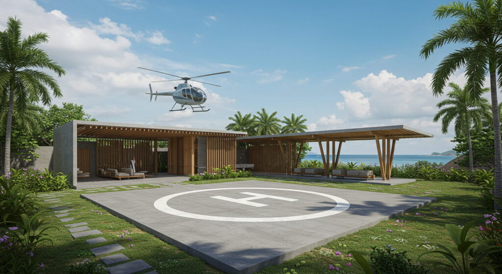 Our exterior design services for heliports in Bali focus on creating functional, safe, and aesthetically pleasing spaces that accommodate helicopter landings and take-offs while blending seamlessly with the island’s natural surroundings. Using durable materials and innovative design elements, we ensure the heliport is well-marked, easily accessible, and equipped with safety features, while maintaining a visually appealing and environmentally conscious design. Experience a heliport that combines modern functionality with the beauty of Bali, offering both efficiency and a striking connection to the tropical landscape.