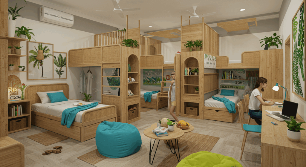 Our Interior Design Services for Student Housing in Bali create vibrant and functional living spaces. We focus on maximizing space with study areas, communal lounges, and private rooms, using modern furnishings and lively colors to foster community and support academic success.