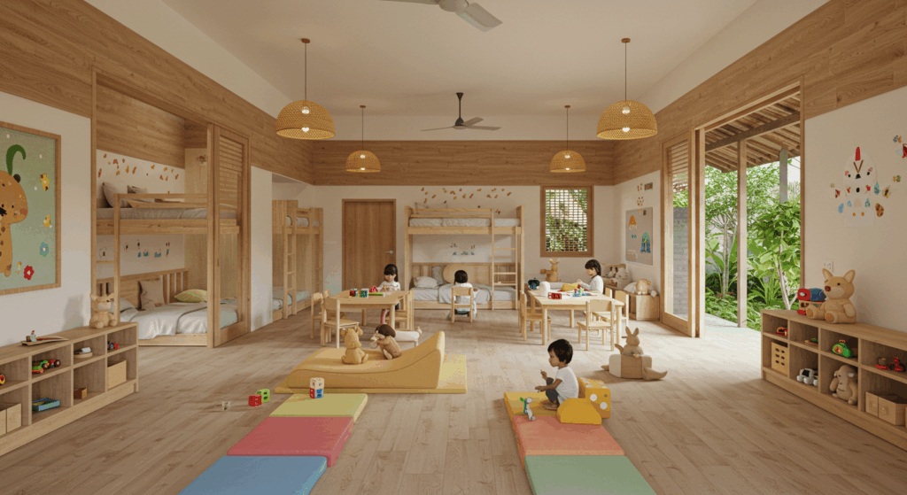 Our interior design services for orphanages in Bali create warm, nurturing, and functional spaces that provide comfort, security, and a sense of belonging for children. We design environments that reflect Bali’s cultural charm, ensuring spaces that support emotional well-being while meeting the practical needs of growing children.