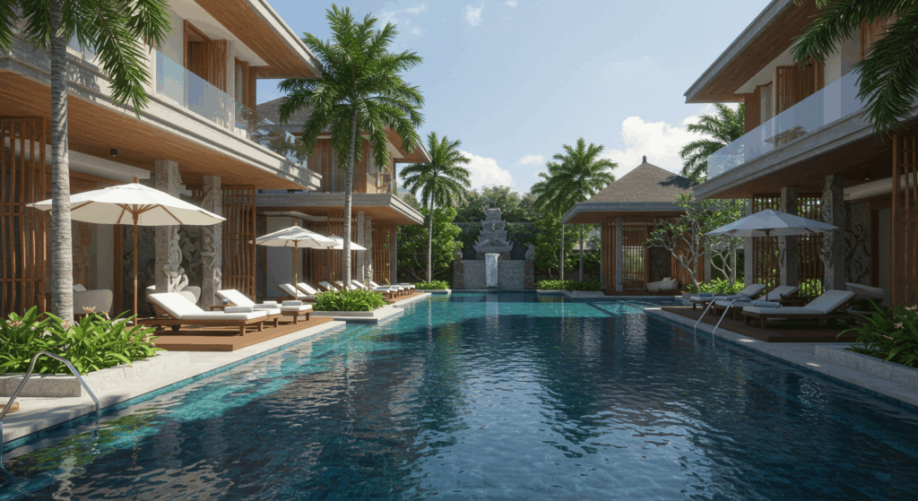 Our interior design services for public swimming pools in Bali create functional, aesthetically pleasing, and safe aquatic spaces. We design environments that enhance community recreation, ensuring a balance of safety and relaxation, while embracing Bali’s tropical charm and integrating natural elements into the overall aesthetic.